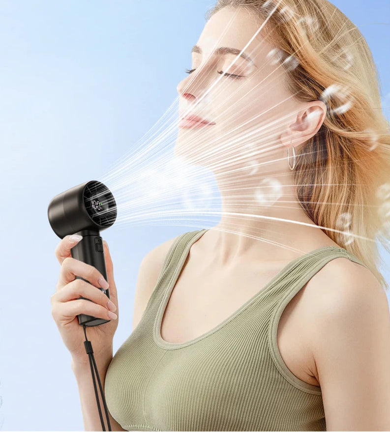 This handheld fan from coldSky features five adjustable wind speeds, delivering powerful airflow up to 9m/s for effective cooling in any setting. Its 4000mAh rechargeable battery provides 3 to 12 hours of continuous use, depending on the selected speed. The fan includes a high-performance brushless motor and a smart LED display showing wind speed and battery status. Lightweight at just 180g, it comes with an anti-loss strap for easy portability. Note: the fan requires a 3-second long press to power on. Ideal for outdoor activities, travel, or quick makeup setting.